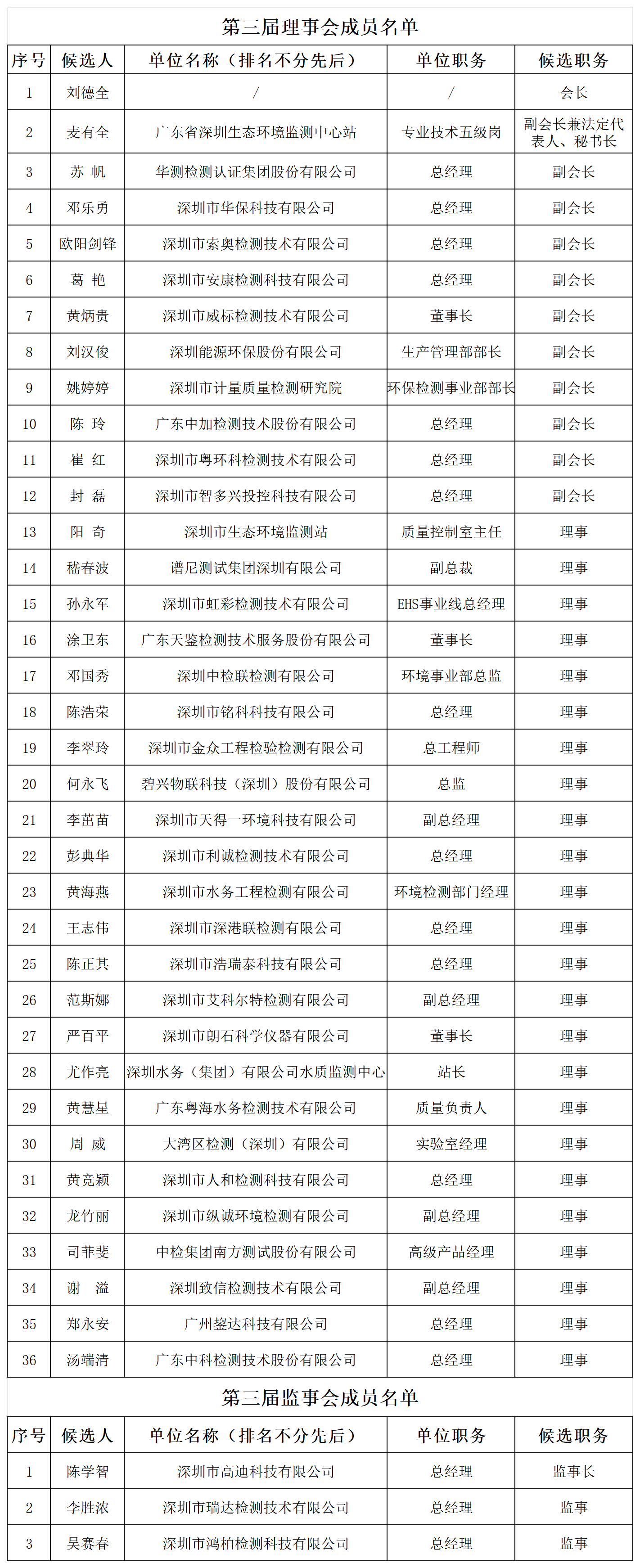 根据《广东省社会组织换届选举工作指引(试行)》、《深圳市环境监测协会换届选举方案》要求,经我会第三届会员大会第一次会议选举,现将第三届理事会、监事会及负责人予以公示。